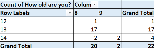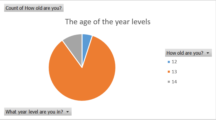 This survey shows how old students are in year 8 and 9. In year 8, there is 1 12 year old, 17 13 year olds and 2 14 year olds. In year 9, there is 2 14 year olds.