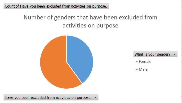 This survey shows the number of genders that have been excluded from activities on purpose. 6 females said no, 9 males said no, 2 females said yes and 5 males said yes.